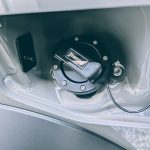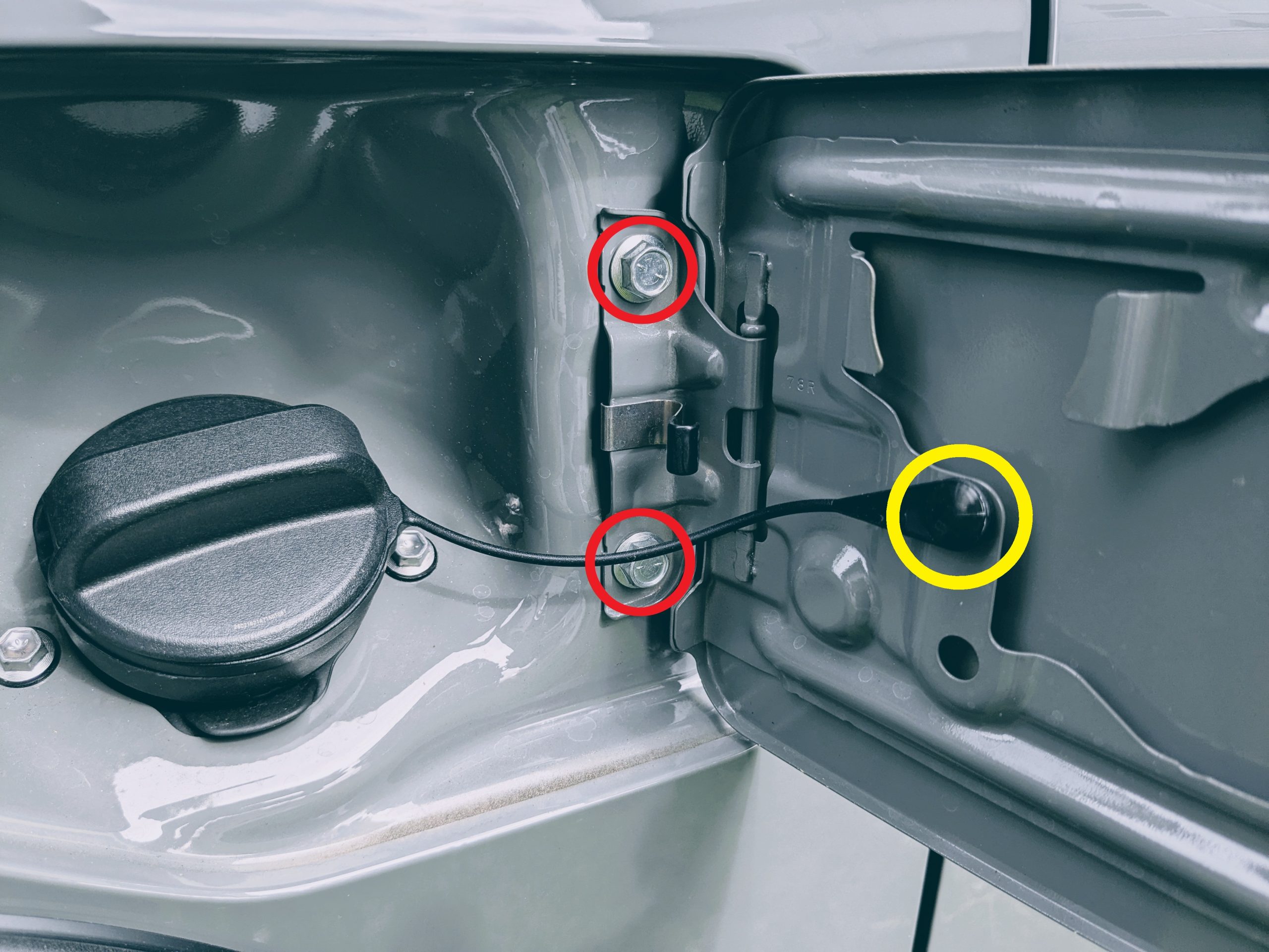 給油口を開いたら、最初に黄〇で印を付けたキャップ用の「脱落防止コード」を外しましょう。