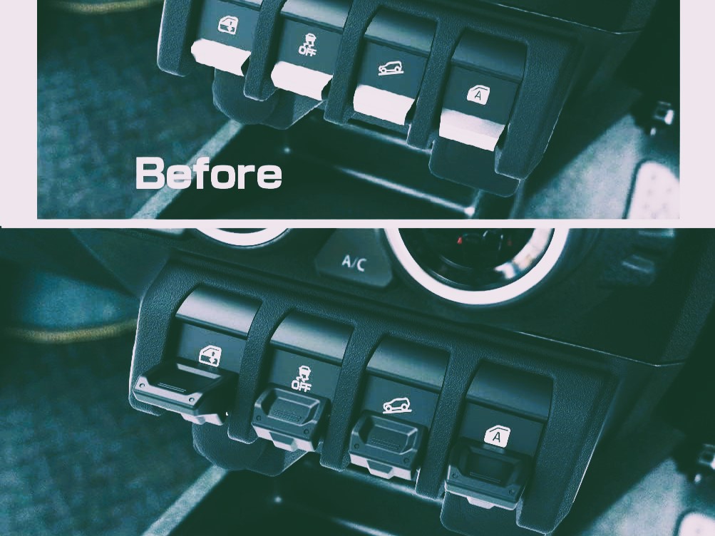 「ジムニーを手に入れて最初に取り付けたのがこのパーツです。スイッチが暗い車内でも見ずに操作できるようになり、誤操作がなくなりました。両面テープで取り付けるだけなので、簡単に快適さが向上しました。」